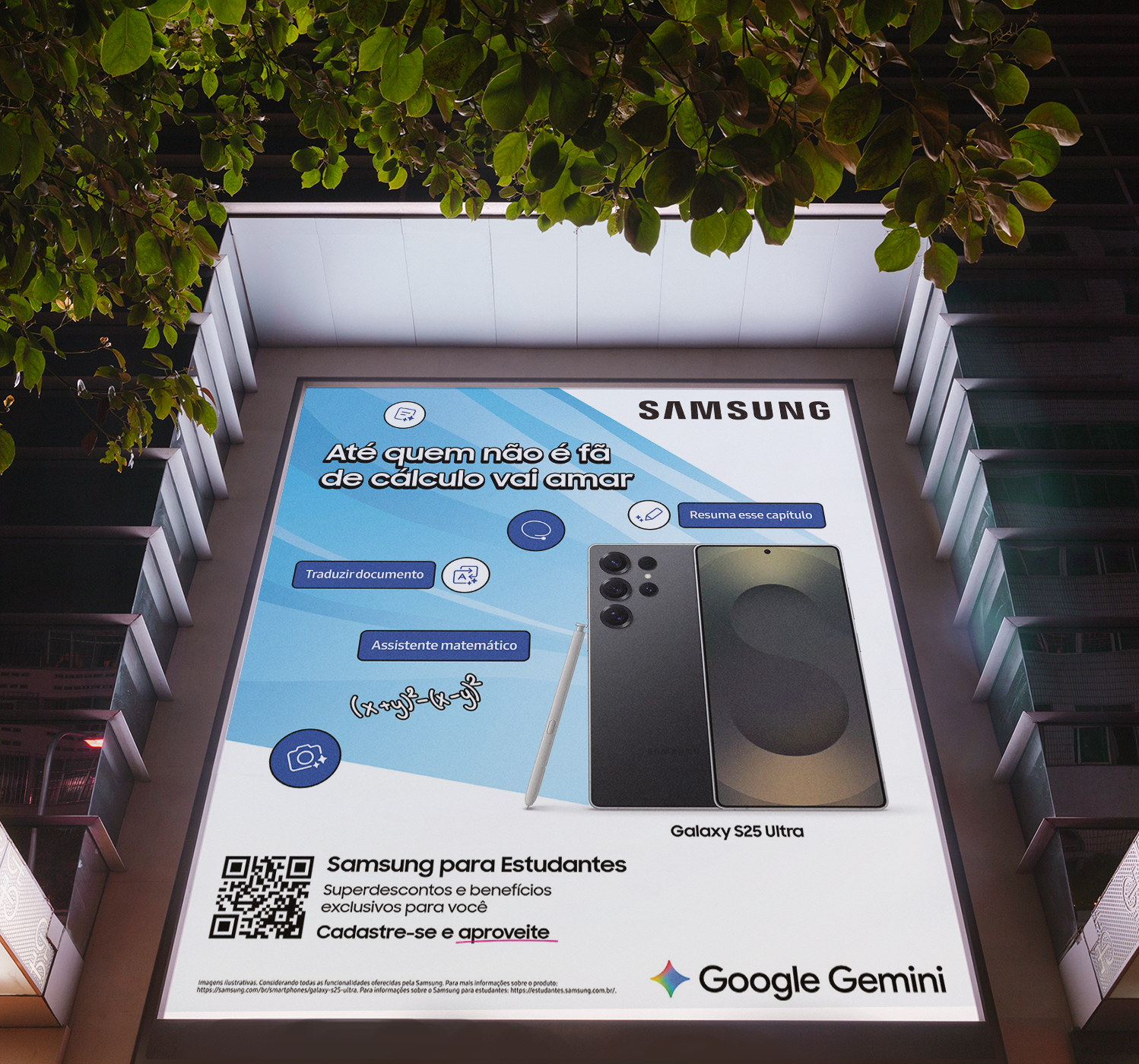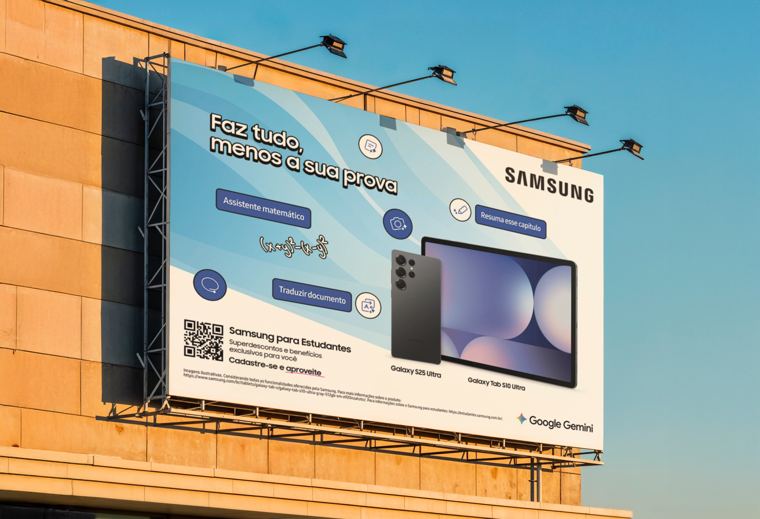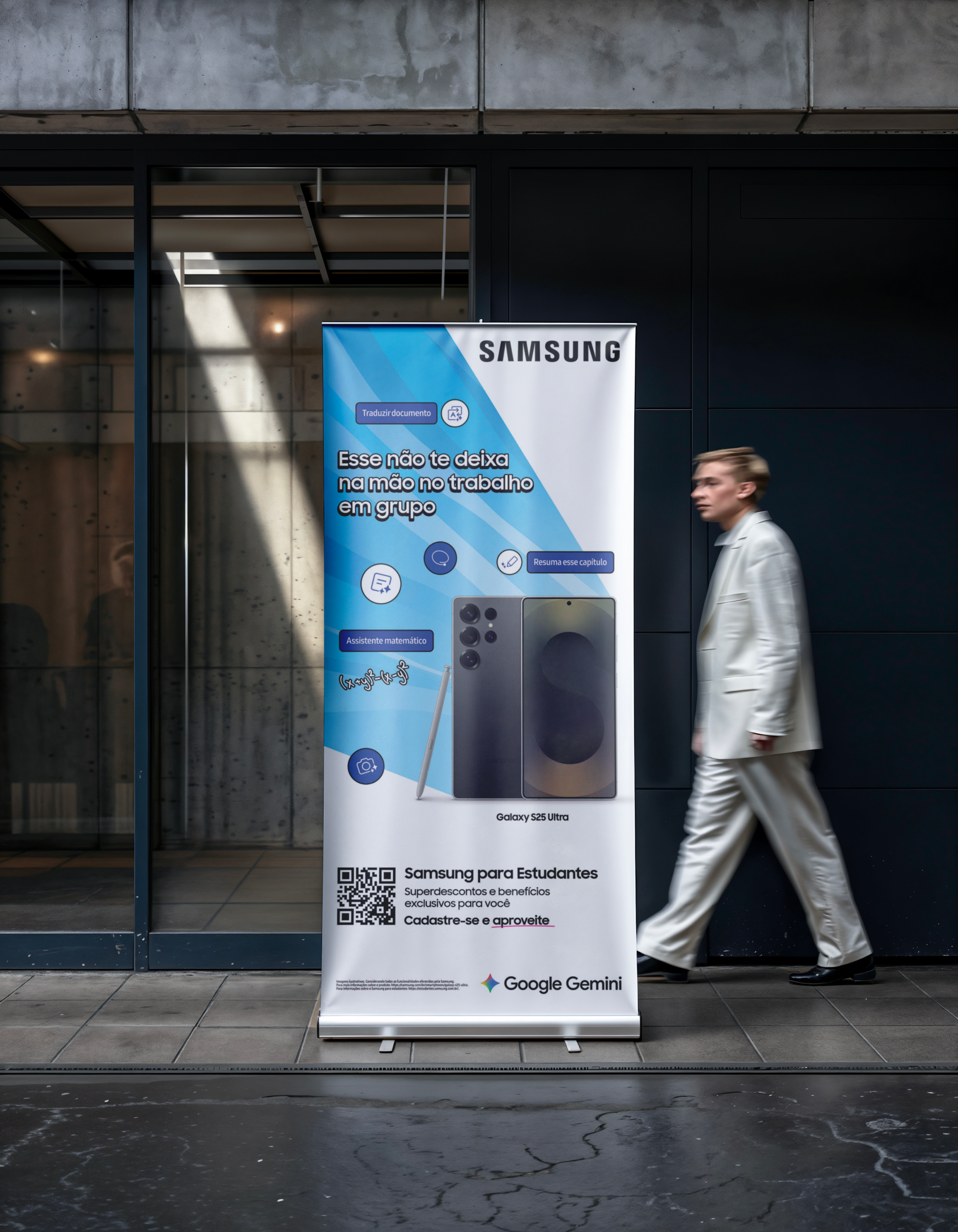 To promote the Samsung Student Program at Metodista University through a vibrant, Gen-Z-focused campaign. The goal was to transform 30+ physical media touchpoints into an “instagrammable” journey that highlights the power of Samsung AI integrated with Google Gemini.